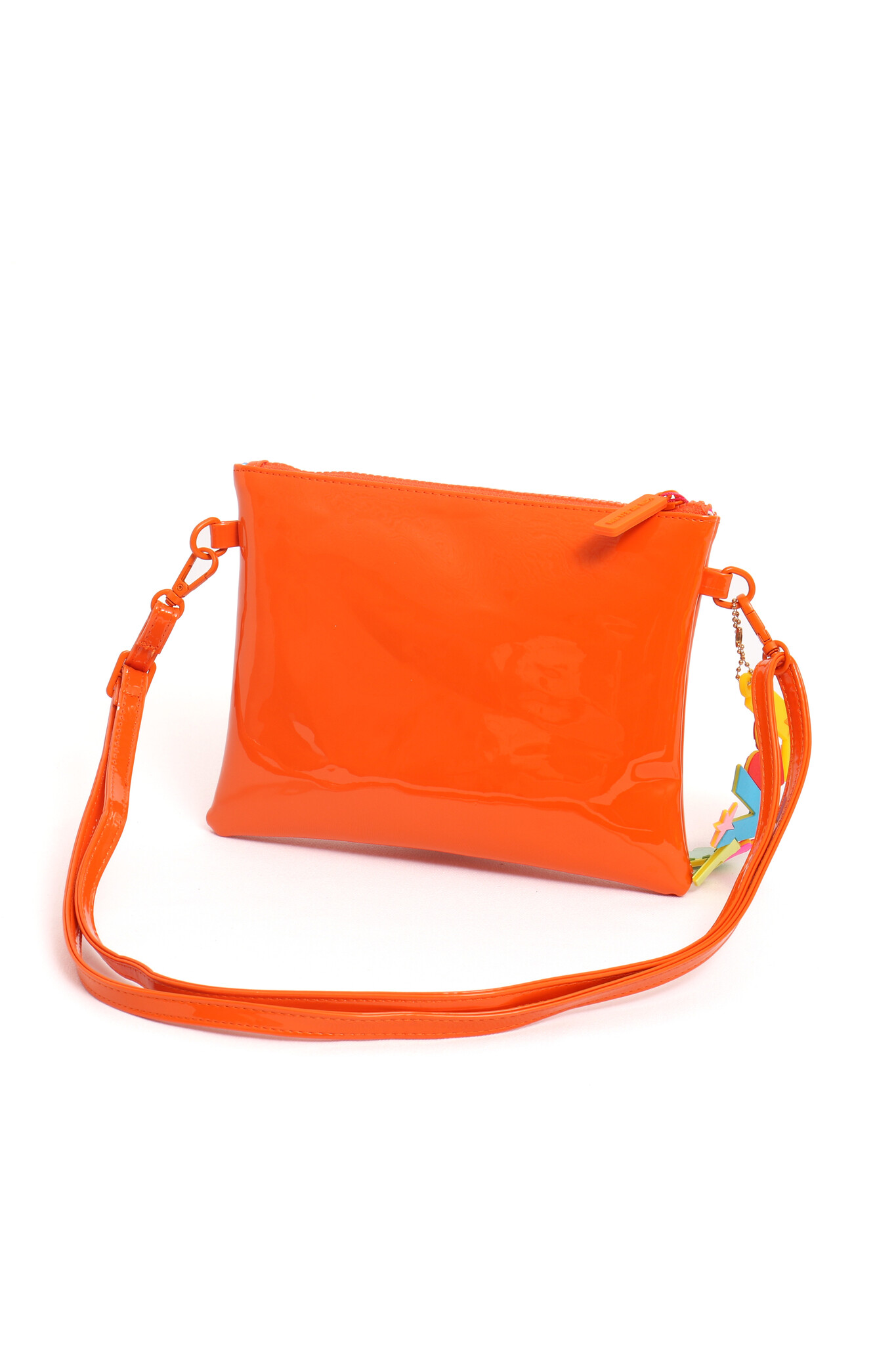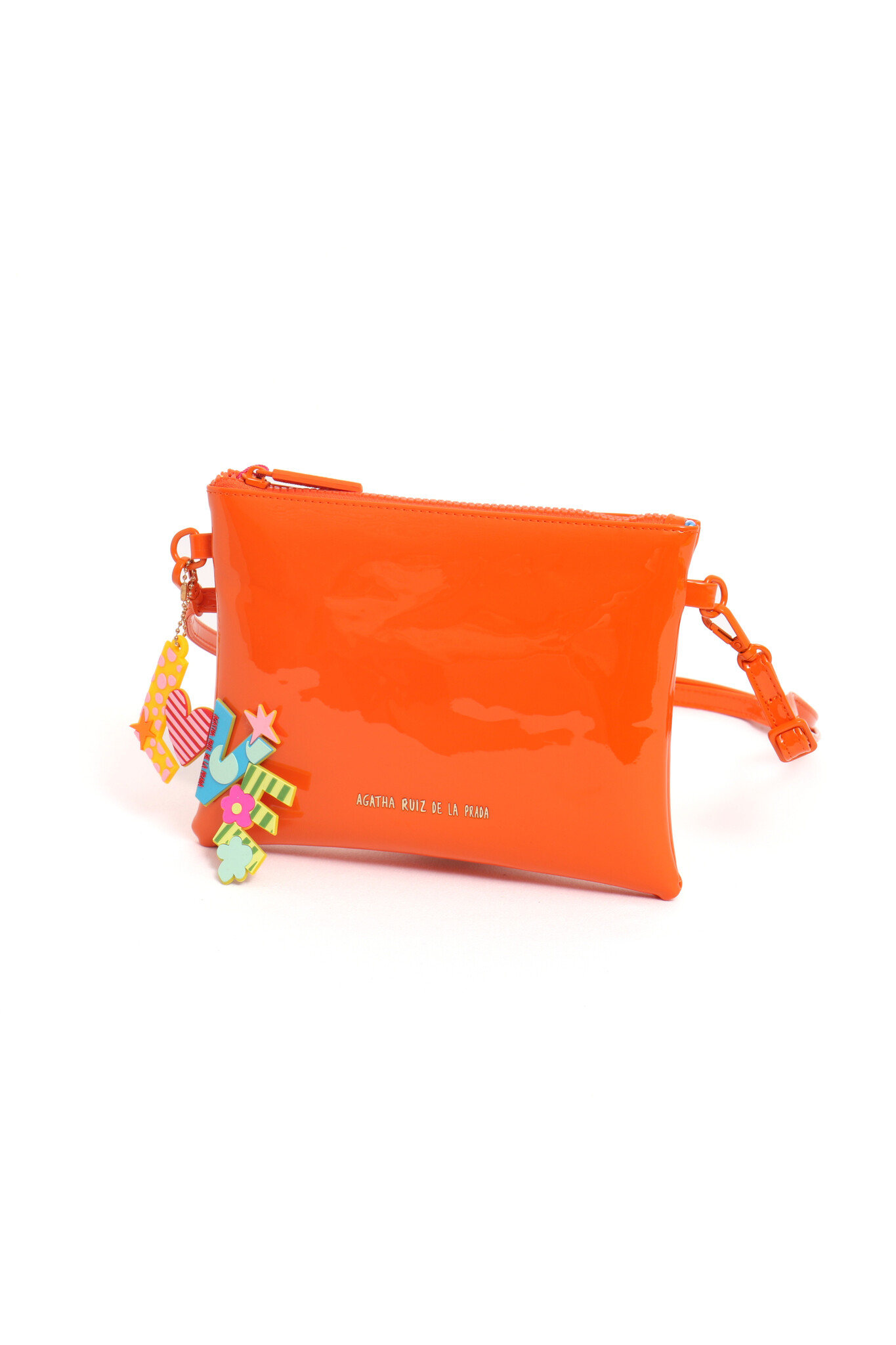 Bolso plano pvc LOVE plastificado en color naranja con cremallera en el mismo color. Medidas: 22×17 cm.