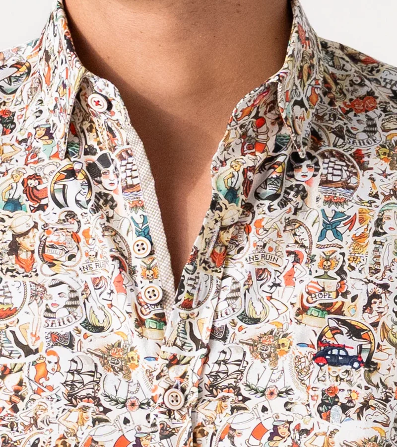 Revive la magia de un concierto al aire libre con esta camisa donde cada nota de color narra una historia de rock y libertad. Un diseño vibrante que transforma tu estilo en una sinfonía visual inolvidable para conquistar cualquier escenario.