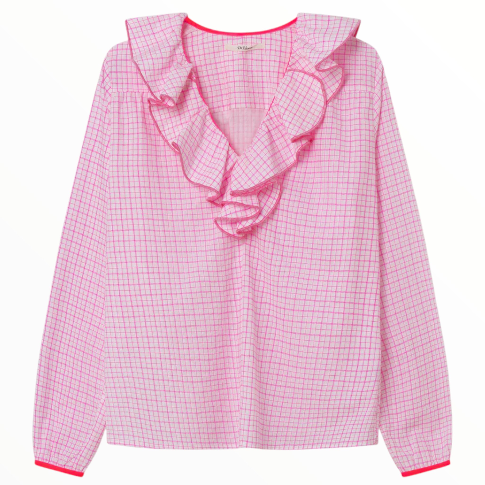 Camisa estampada a cuadros rosa neón sobre fondo blanco. Corte recto y fluido. Escote en V con maxi volante y detalles en color neón. Manga larga con puño elástico y fruncido en la espalda que aporta un aire femenino sin esfuerzo. Confeccionada en algodón ligero y fresco