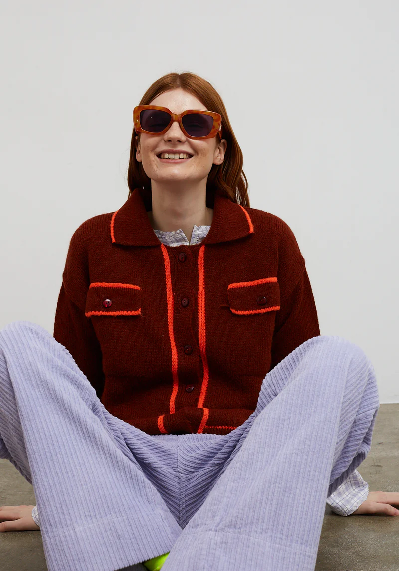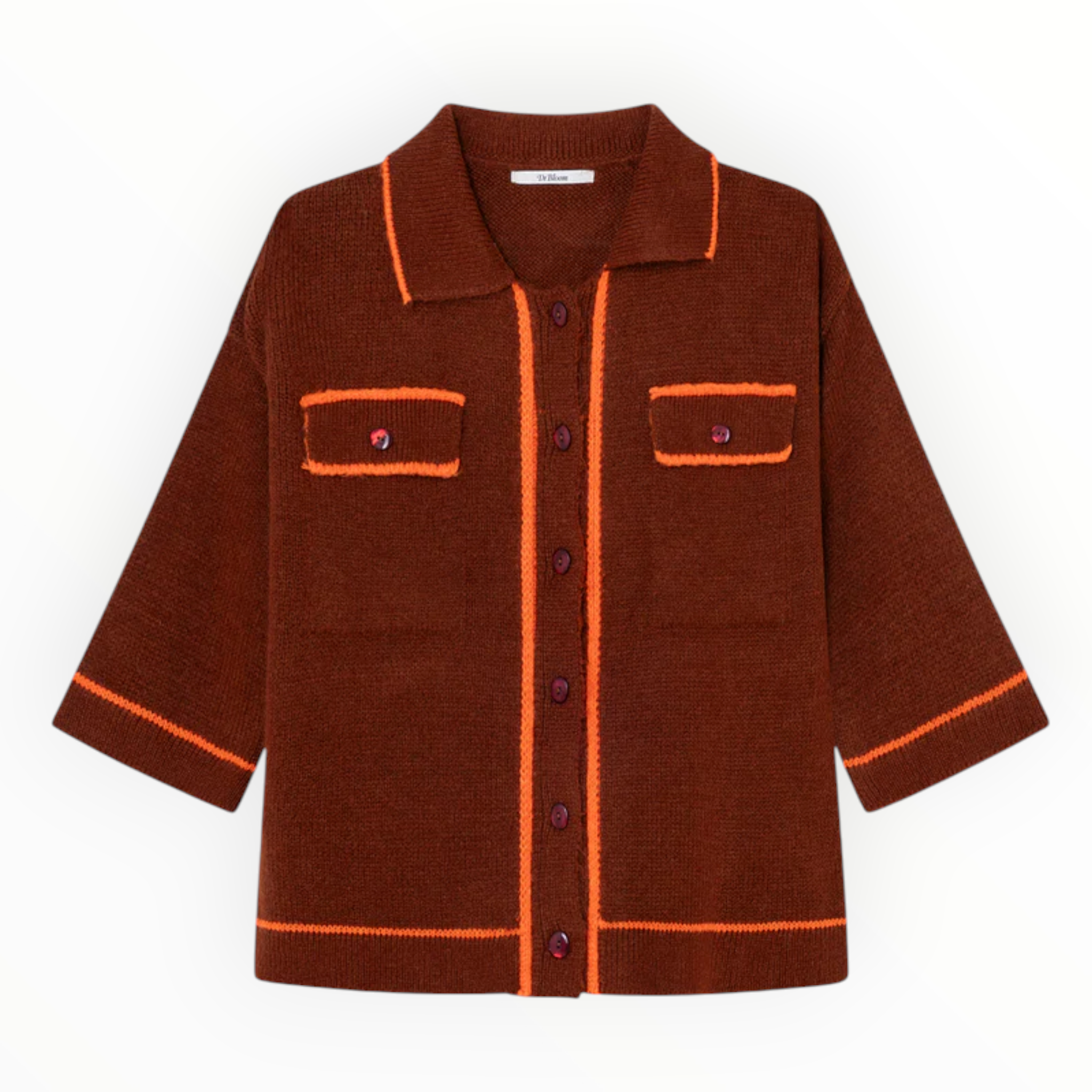 Cárdigan bicolor de manga 3/4 en color marrón con detalles en naranja neón. Corte recto, cuello tipo solapa en punto canalé y bolsillos frontales con botones al tono. Confeccionado en una suave mezcla de lana gustosa al tacto.