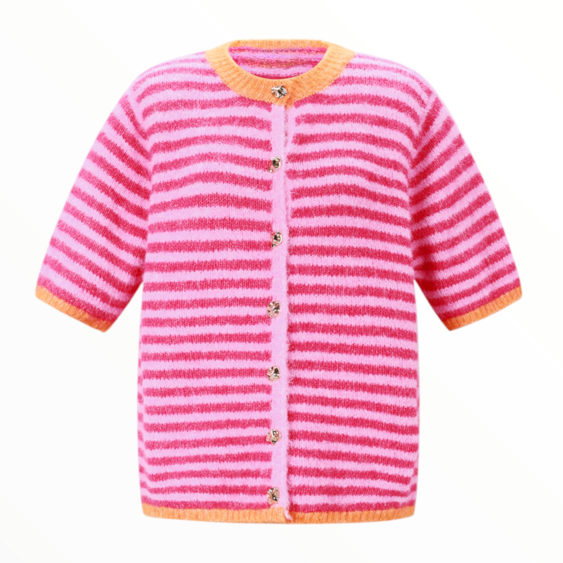 Cárdigan de rayas Fucsia y rosa, con detalles en cuello y mangas naranja
