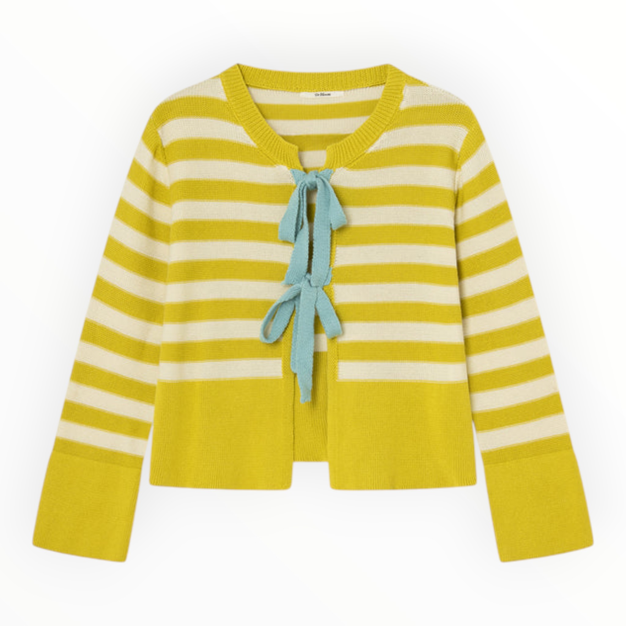 Una chaqueta de punto que combina romanticismo y color de la manera más Bloom. El diseño a rayas en amarillo y crudo aporta un aire fresco, mientras que los lazos frontales en tono verde agua vibrante añaden un toque bloom lleno de personalidad.