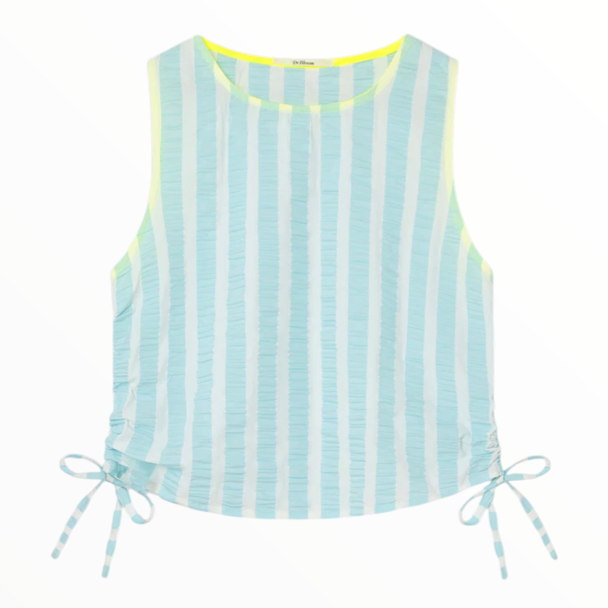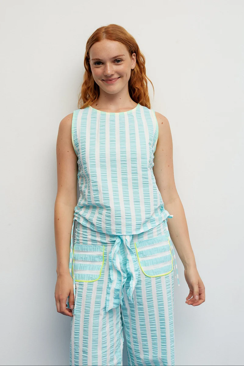 Un cuerpo pensado para aportar luz y frescura a los looks de verano. Su diseño combina rayas verticales en agua y blanco sobre un tejido con relieve sutil que añade textura y movimiento. Los lazos laterales ajustables permiten fruncir la silueta, ofreciendo un detalle personalizado y único. Con cuello redondo y un corte recto, es una prenda ligera y cómoda, perfecta para los días cálidos.