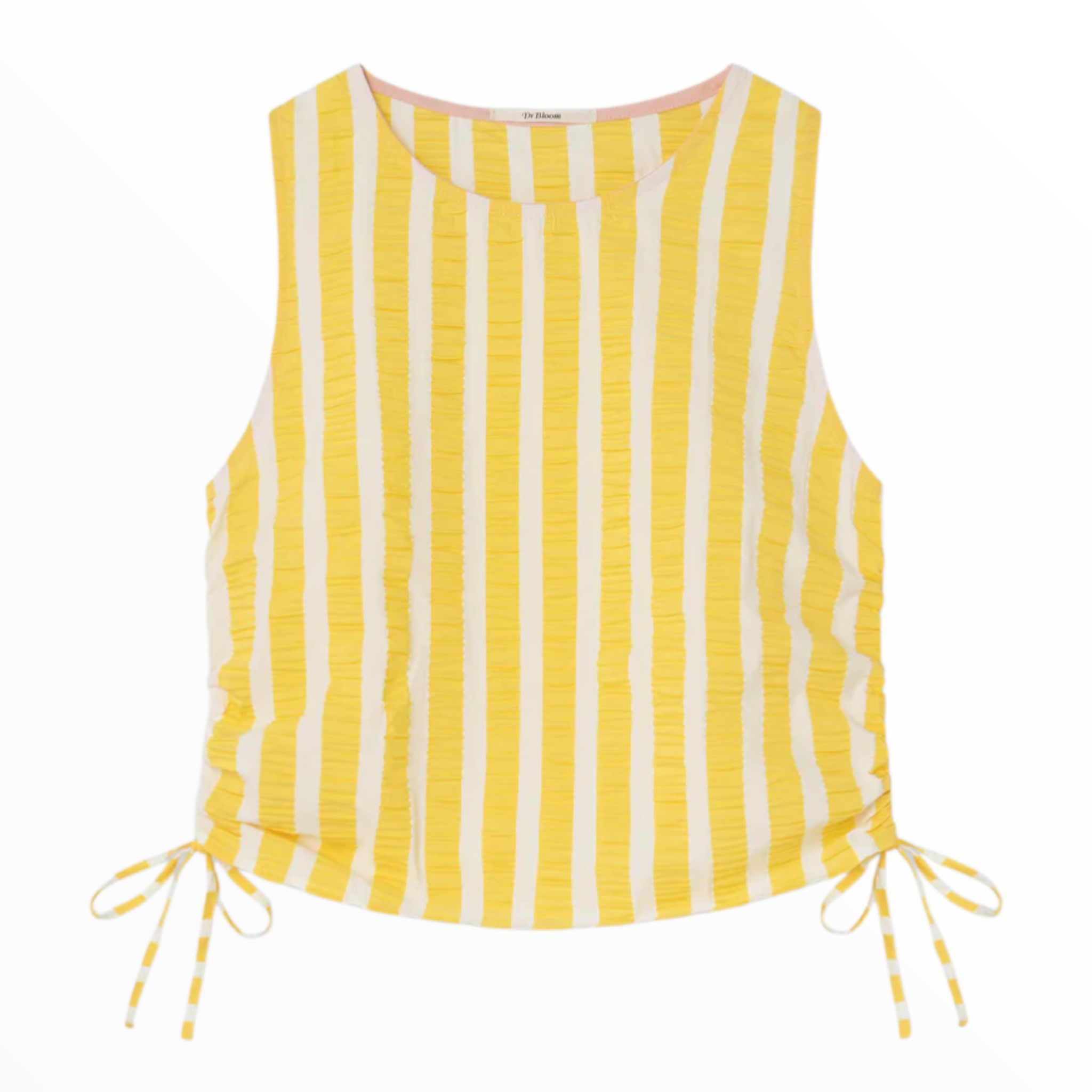 Un cuerpo pensado para aportar luz y frescura a los looks de verano. Su diseño combina rayas verticales en amarillo y blanco sobre un tejido con relieve sutil que añade textura y movimiento. Los lazos laterales ajustables permiten fruncir la silueta, ofreciendo un detalle personalizado y único. Con cuello redondo y un corte recto, es una prenda ligera y cómoda, perfecta para los días cálidos.