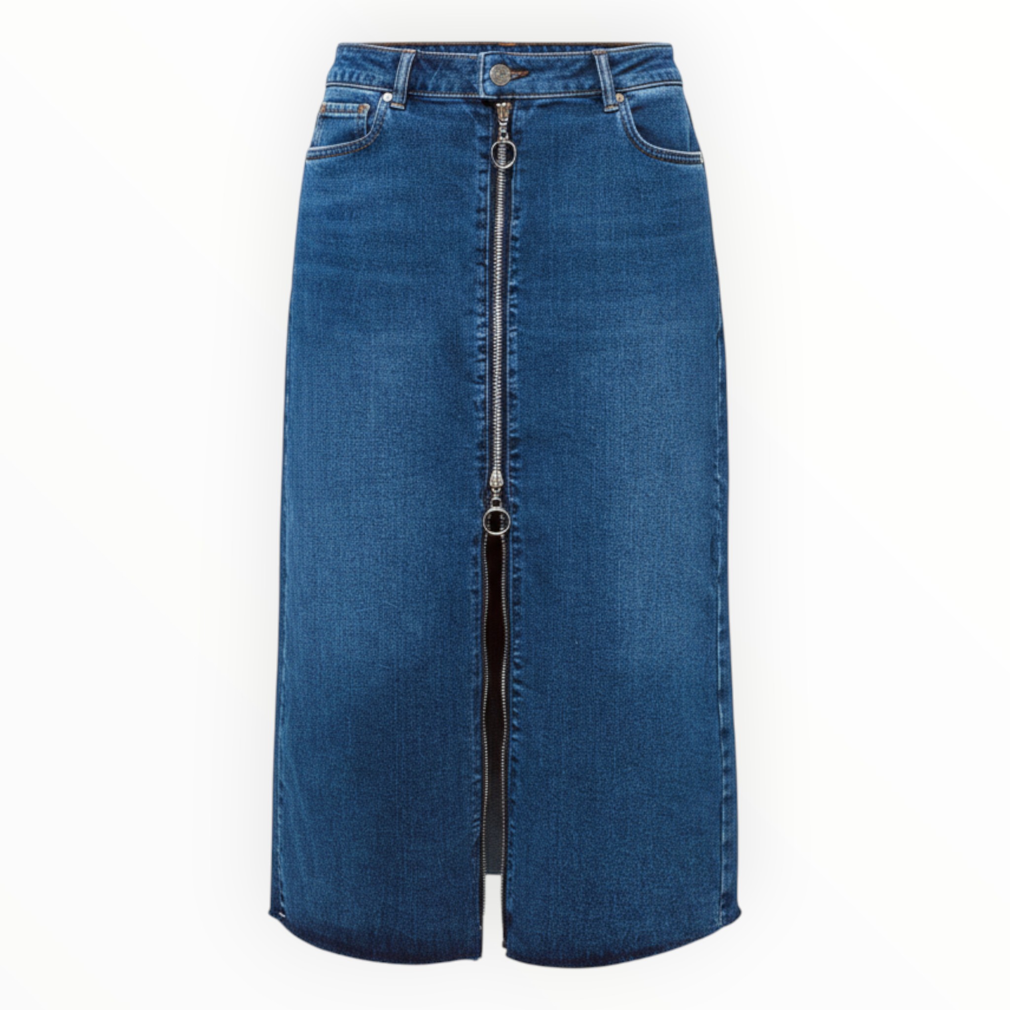 Maxi falda larga azul oscuro con detalle de cremallera larga en la parte delantera y abertura en la espalda. Cinco bolsillos y perfecta para el día a día. De tiro alto y largo midi