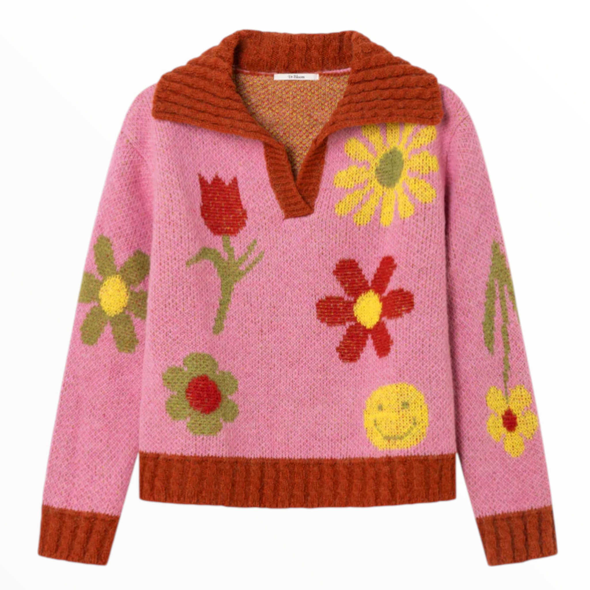 Jersey rosa con jacquard de maxi flores en tonos amarillo, verde y teja. Cuello marinero, corte recto y manga larga. Detalle de acabados en punto trenzado en puños, bajo y cuello. Tejido gustoso y esponjoso en mezcla de lana.
