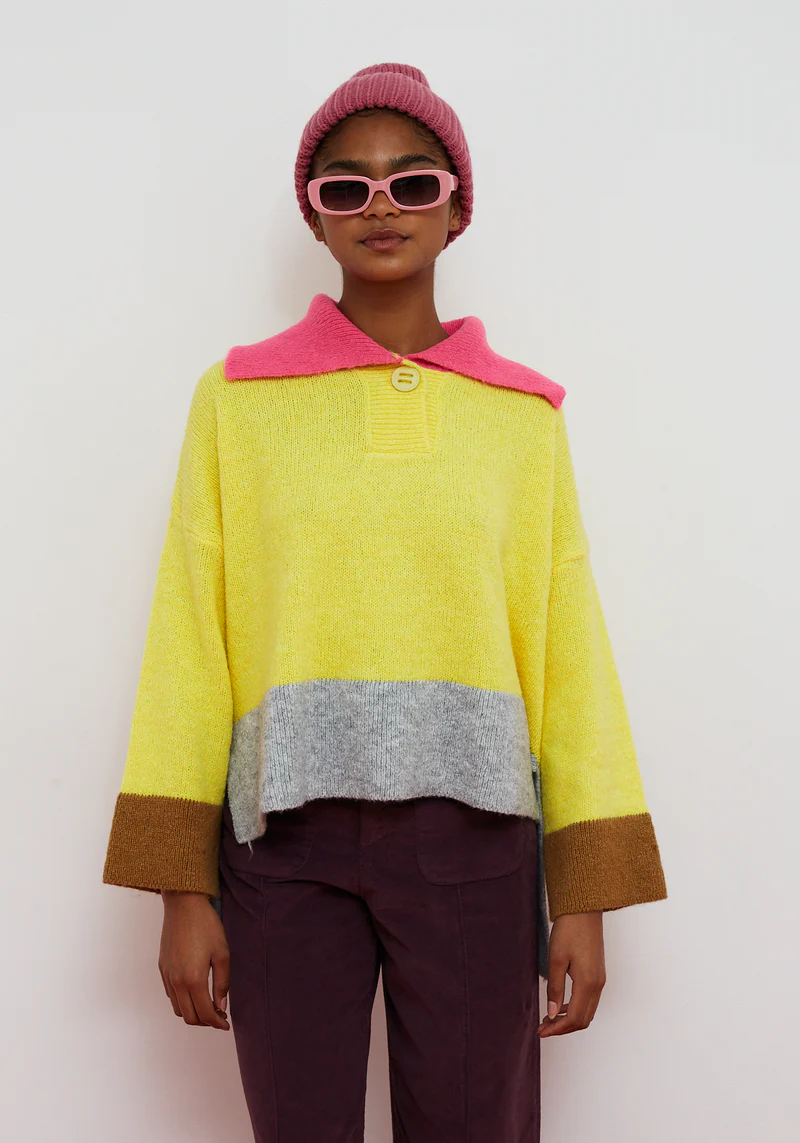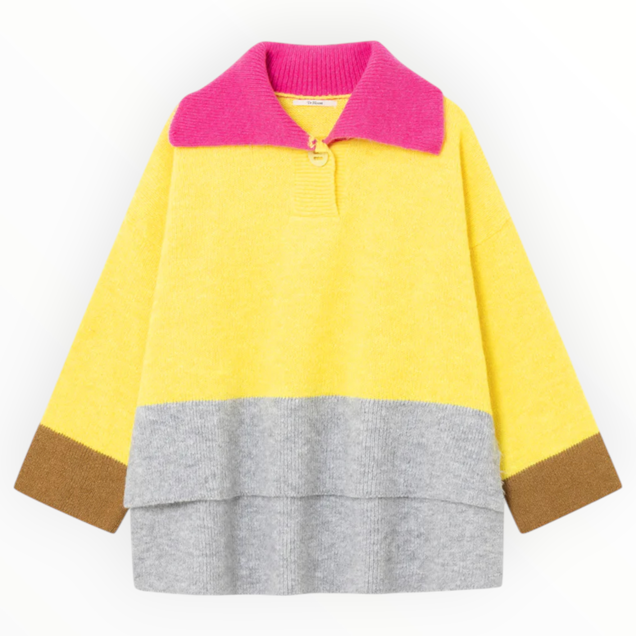 Jersey de corte recto oversize de base color amarillo. Manga caída y acabado en bajo asimétrico color gris con corte lateral. Presenta un cuello XL tipo camisa en color rosa con cierre de botón frontal. Los puños amplios rematados en color marrón aportan un toque original y vibrante.