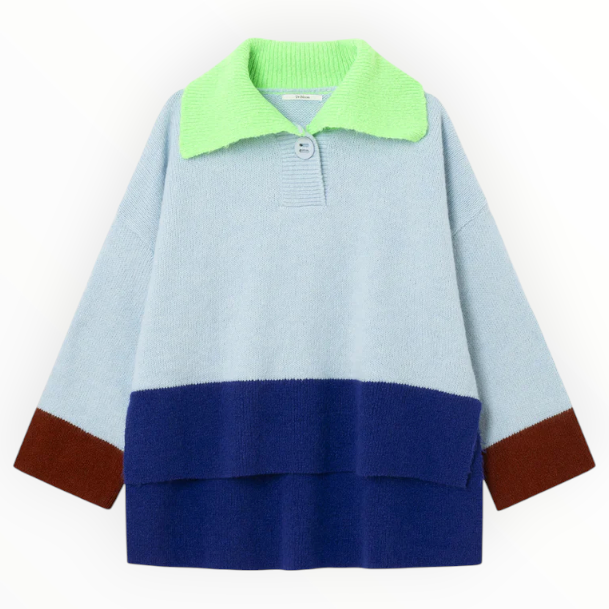 Jersey de corte recto oversize de base color azul. Manga caída y acabado en bajo asimétrico color azul marino con corte lateral. Presenta un cuello XL tipo camisa en color verde flúor con cierre de botón frontal. Los puños amplios rematados en color marrón aportan un toque original y vibrante.