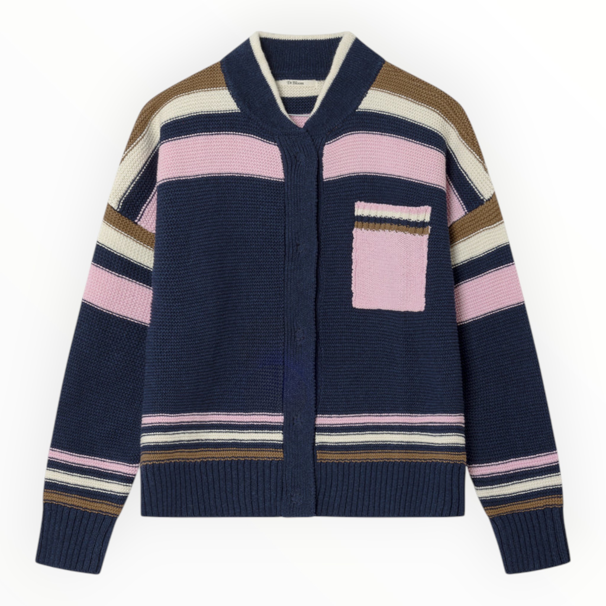 De silueta relajada y punto de algodón agradable, que mezcla franjas de colores en tonos rosa, marrón y crudo sobre un fondo azul marino. El bolsillo frontal en contraste añade un guiño divertido y funcional que rompe la simetría de forma natural.