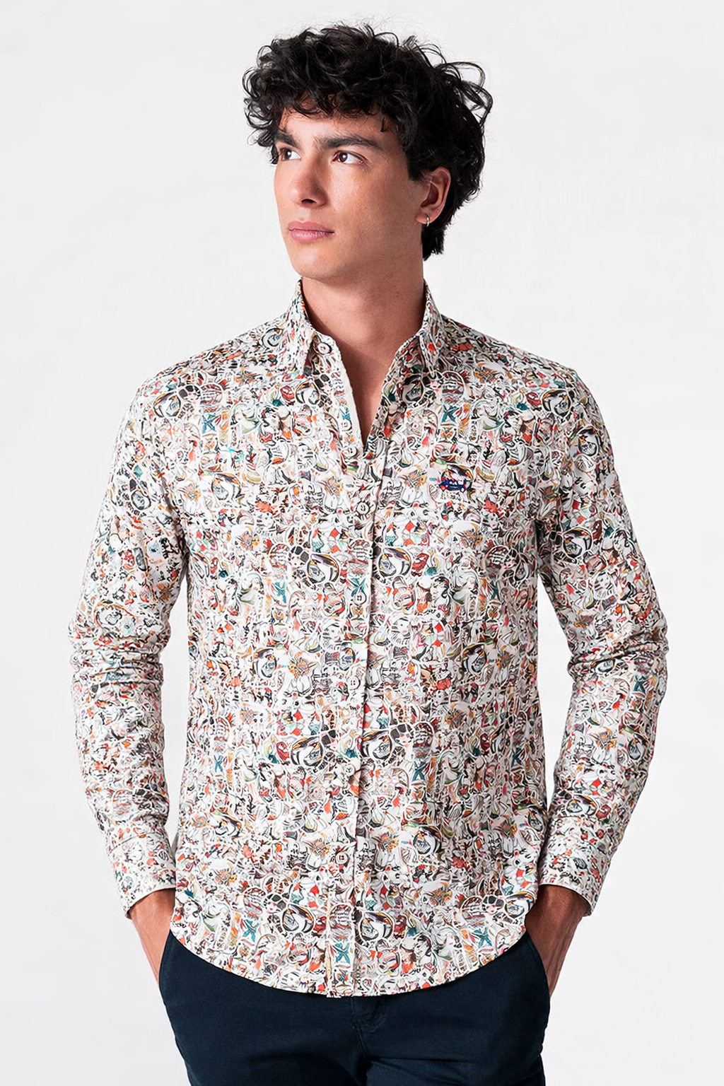 La CAMISA TATOOS Lleva contigo el alma del océano tatuada en una prenda que huele a salitre y a antiguas travesías por mares desconocidos. Un lienzo vibrante de pin-ups y navíos para quienes prefieren que su estilo cuente historias de libertad salvaje.