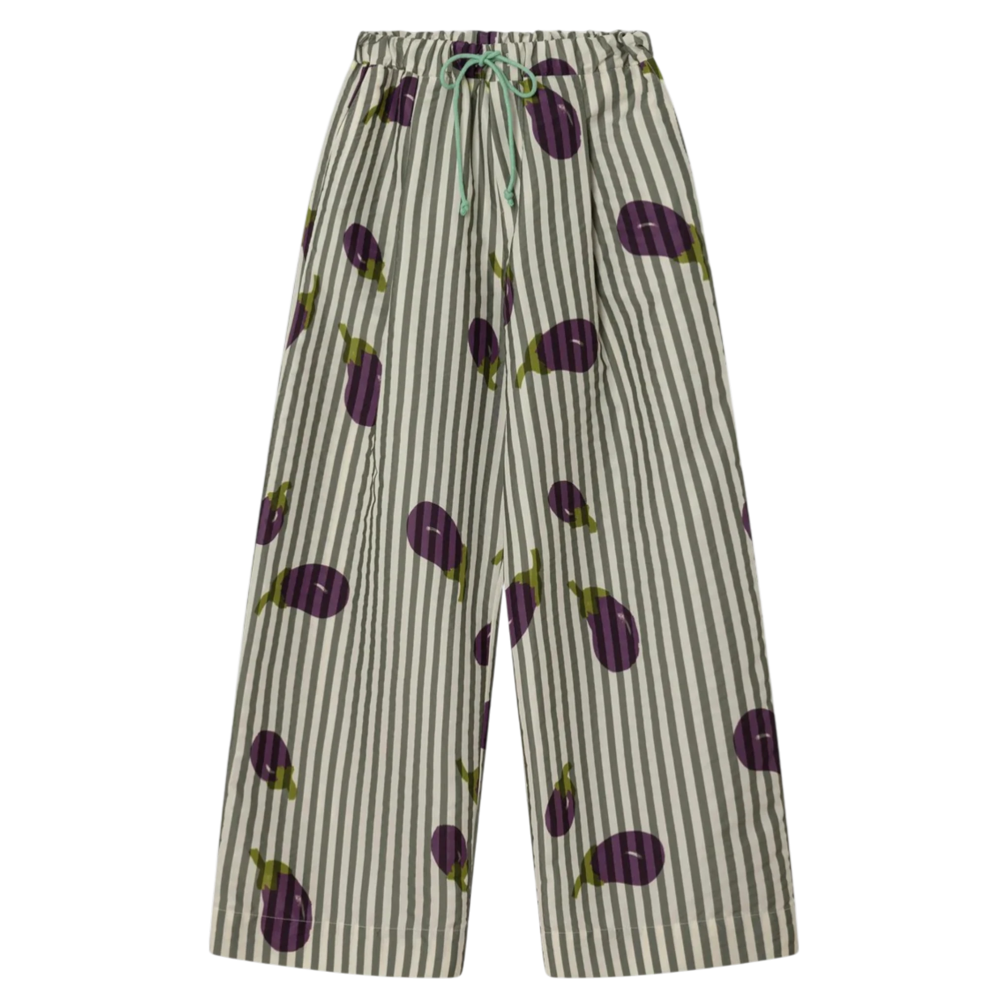 Un pantalón estampado en tejido técnico pensado para aportar comodidad y estilo en tus looks con un corte amplio y relajado. Su diseño combina rayas verticales en azul y blanco con nuestro estampado único de tomates. Tiene una cintura elástica acompañada de un cordón amarillo neón que resalta toda la prenda y le da un toque distintivo y divertido.