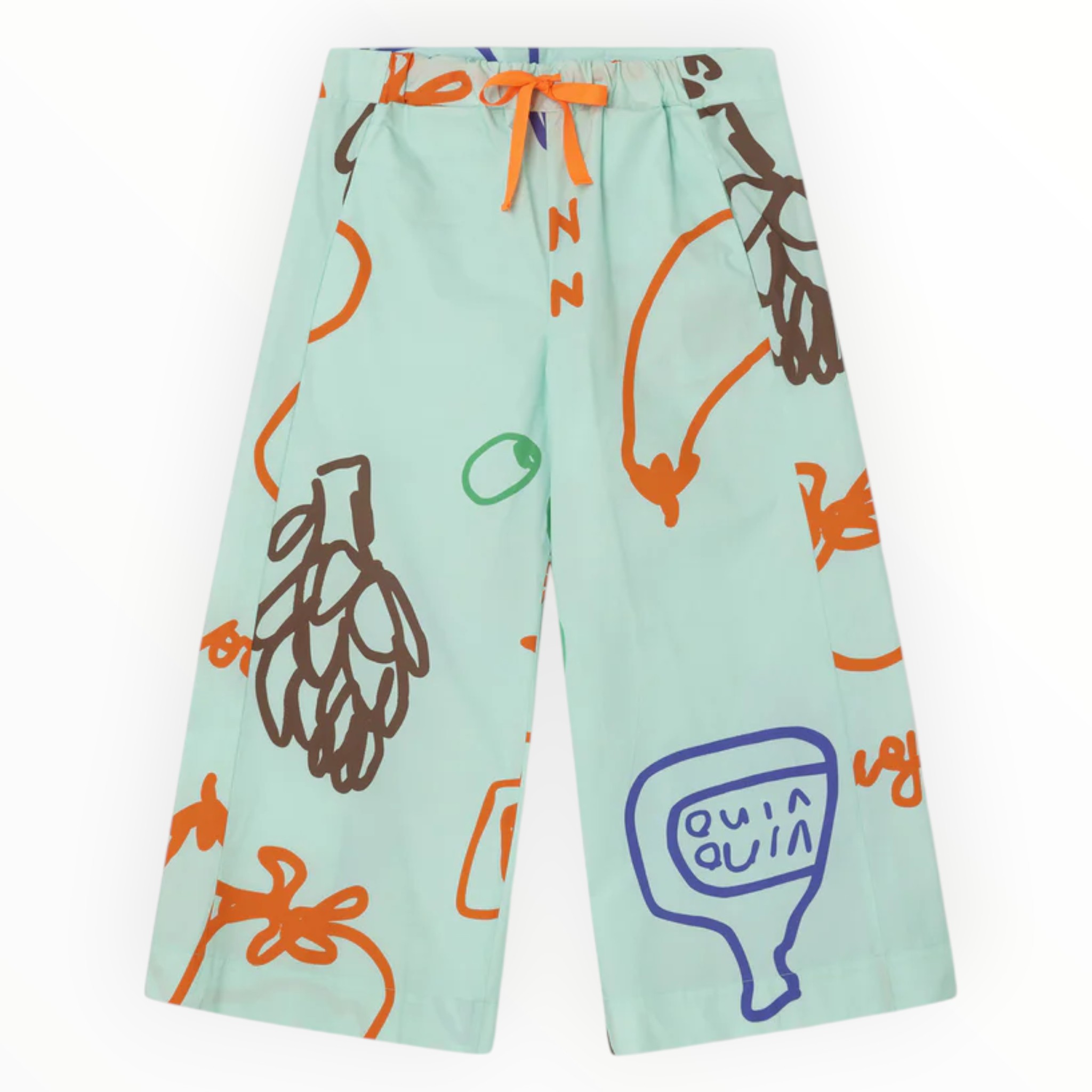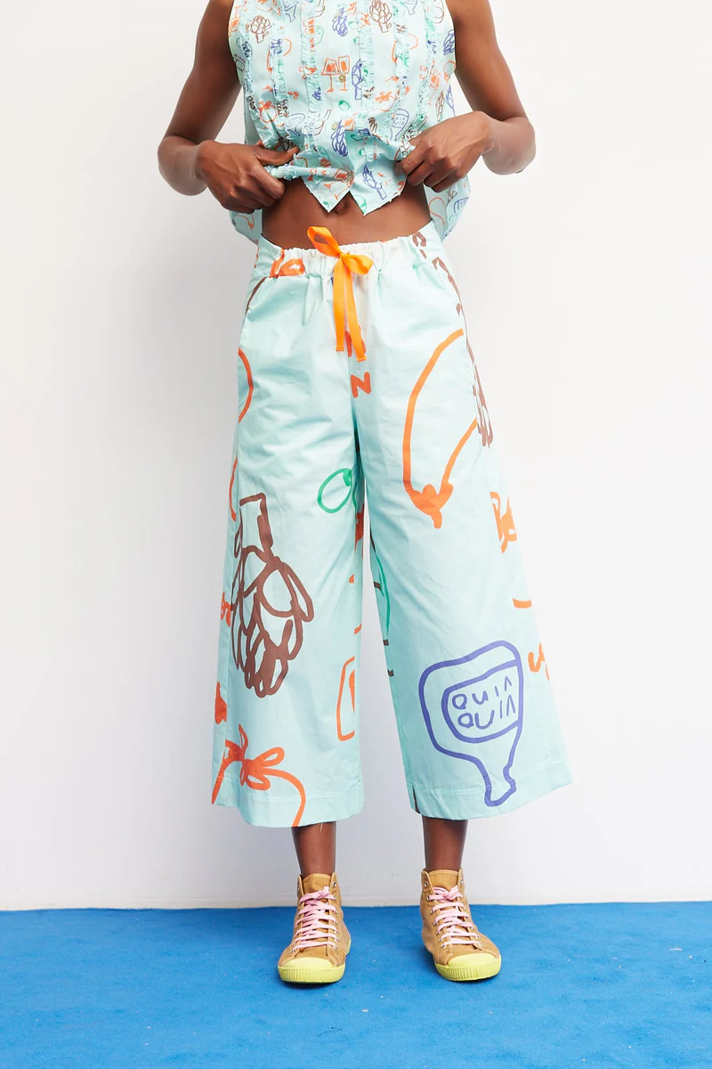 Estos pantalones ligeros de algodón tienen un corte recto y ancho. La cintura elástica cuenta con un cordón ajustable en contraste. El estampado vegetal y los trazos les dan un toque artístico y único. Ideales para combinar con camisas básicas o como conjunto.
