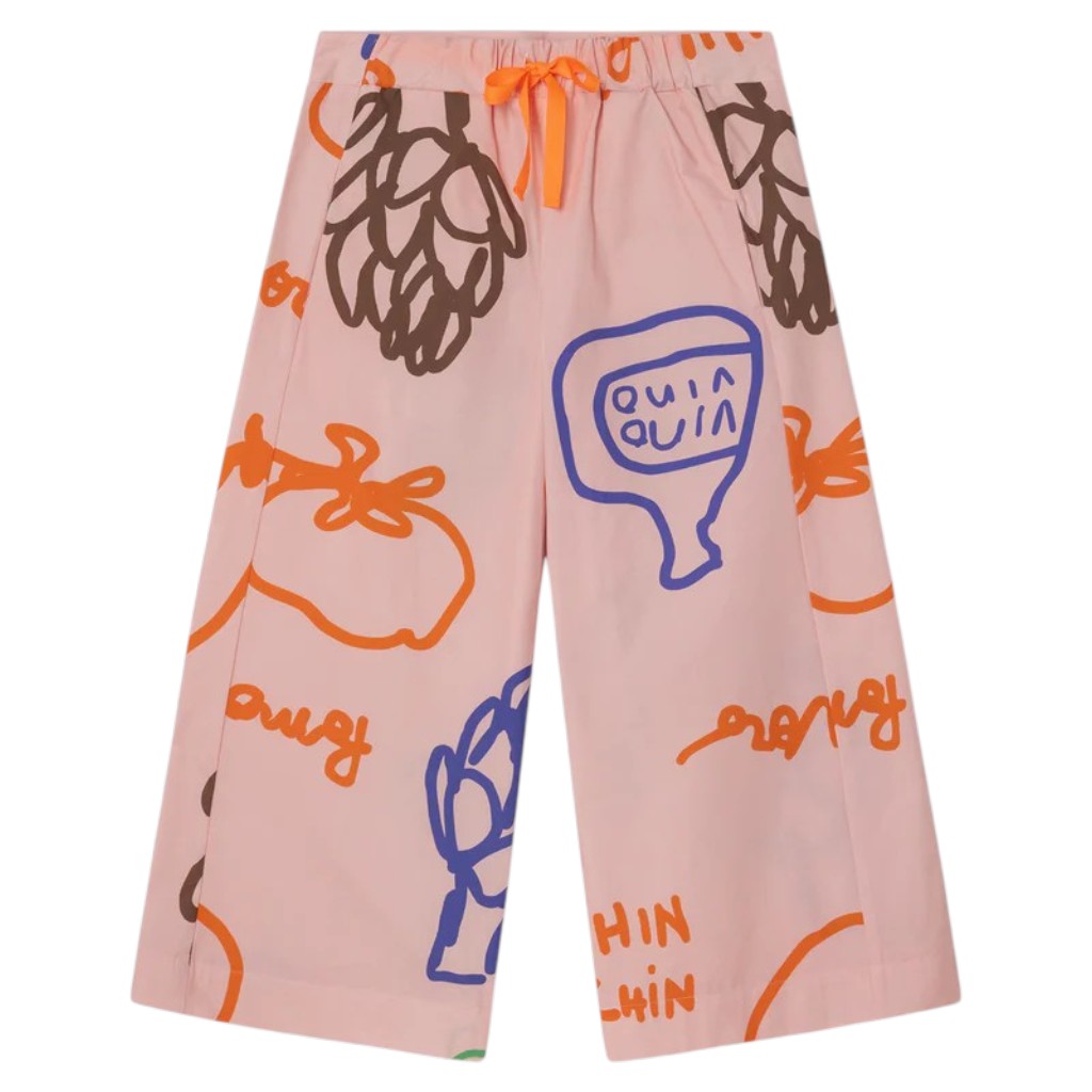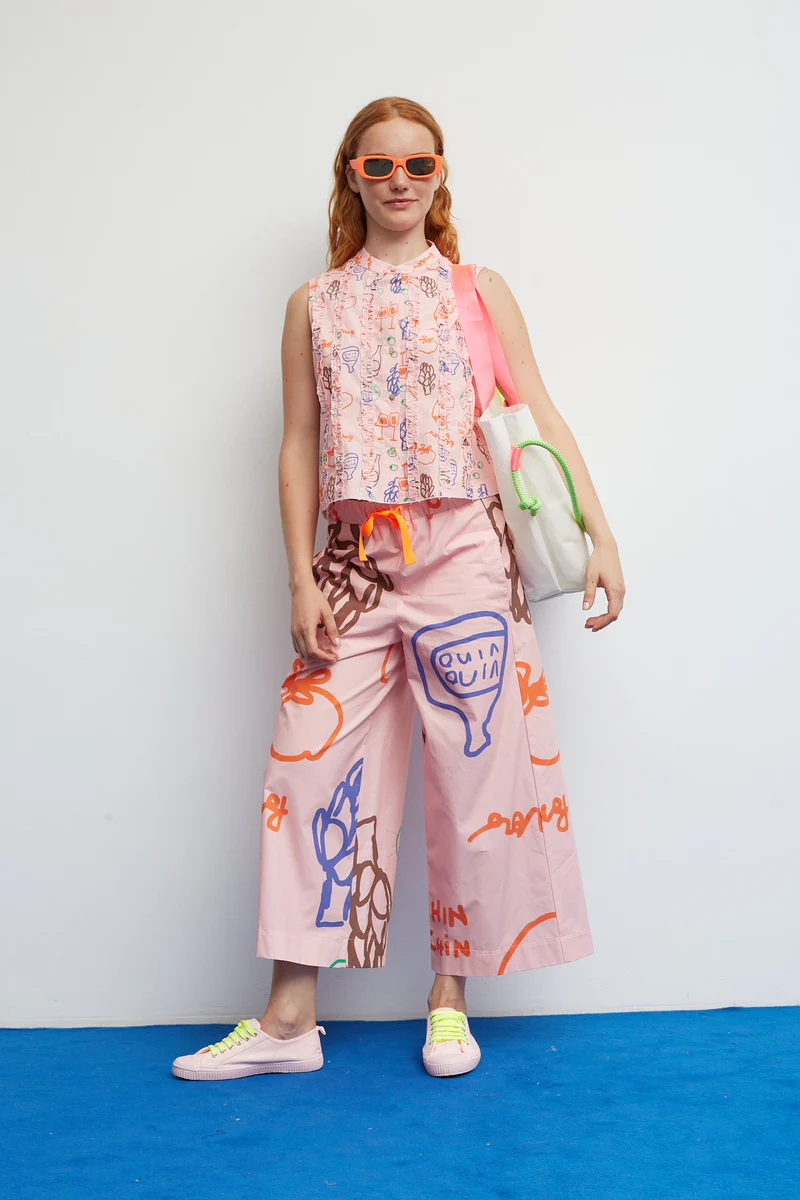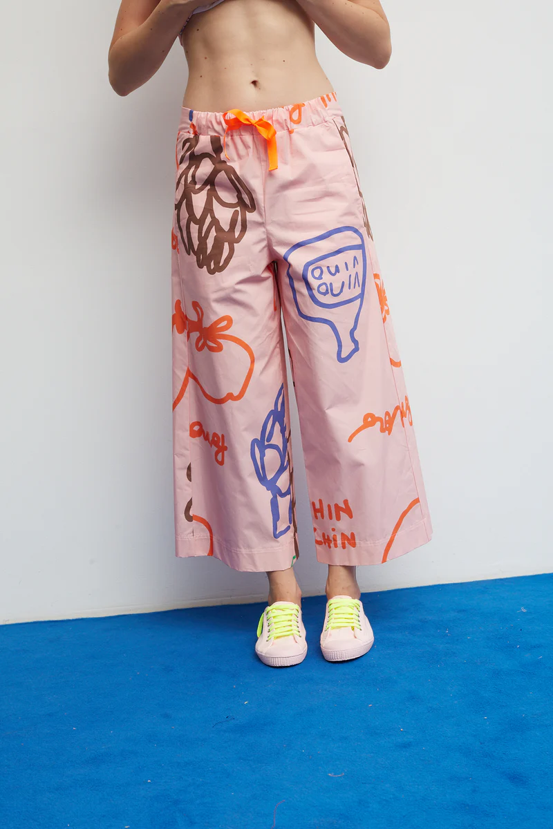 Estos pantalones ligeros de algodón tienen un corte recto y ancho. La cintura elástica cuenta con un cordón ajustable en contraste. El estampado vegetal y los trazos les dan un toque artístico y único. Ideales para combinar con camisas básicas o como conjunto.
