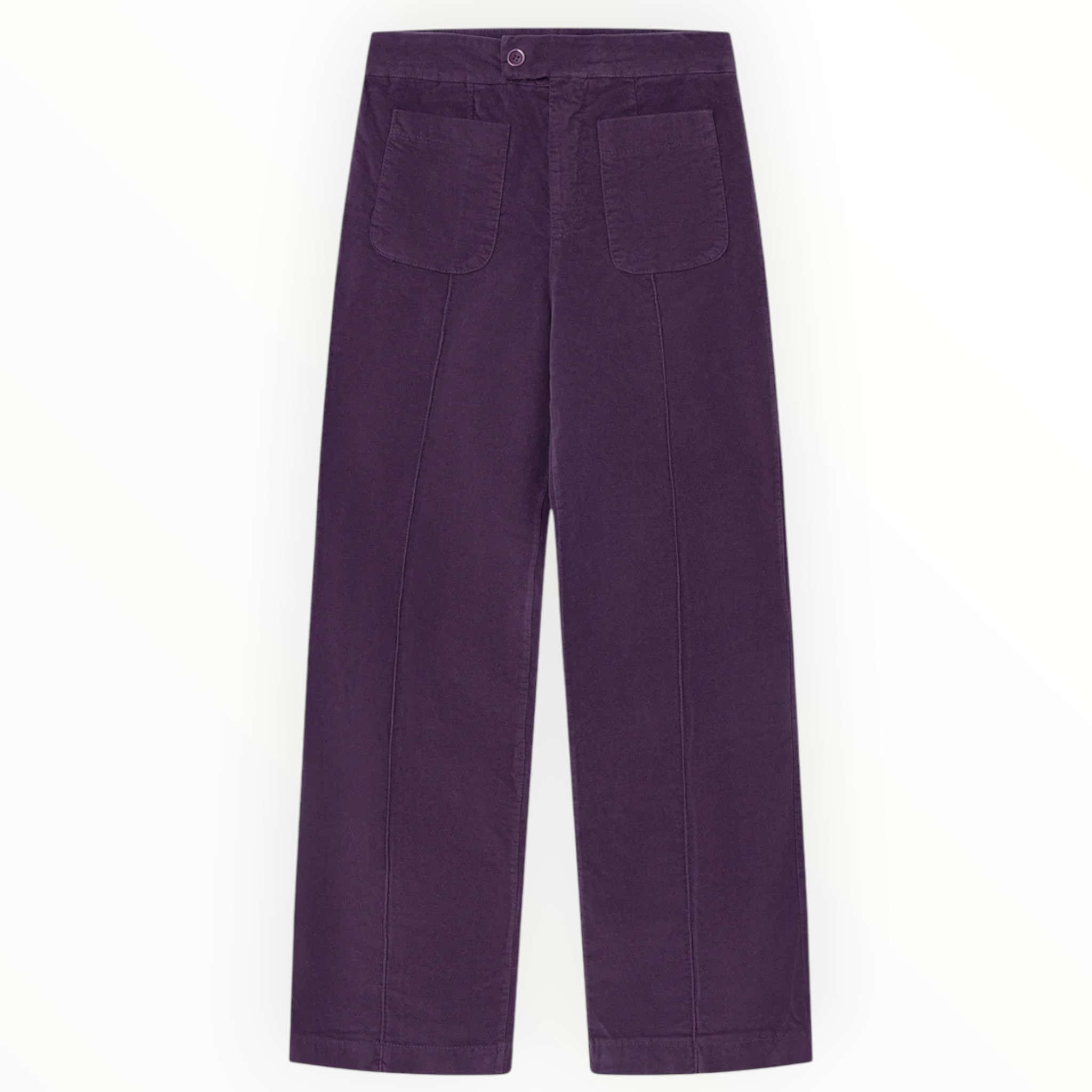 Pantalón de terciopelo color Berenjena. Corte recto y tiro regular. Bolsillos frontales y posteriores cuadrados. Cremallera y botón al tono para un ajuste perfecto. Costuras marcadas verticales en ambas piernas.