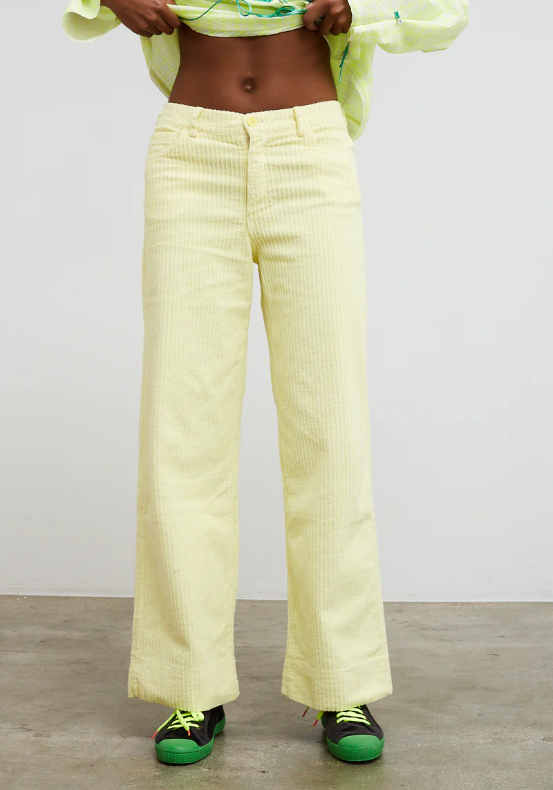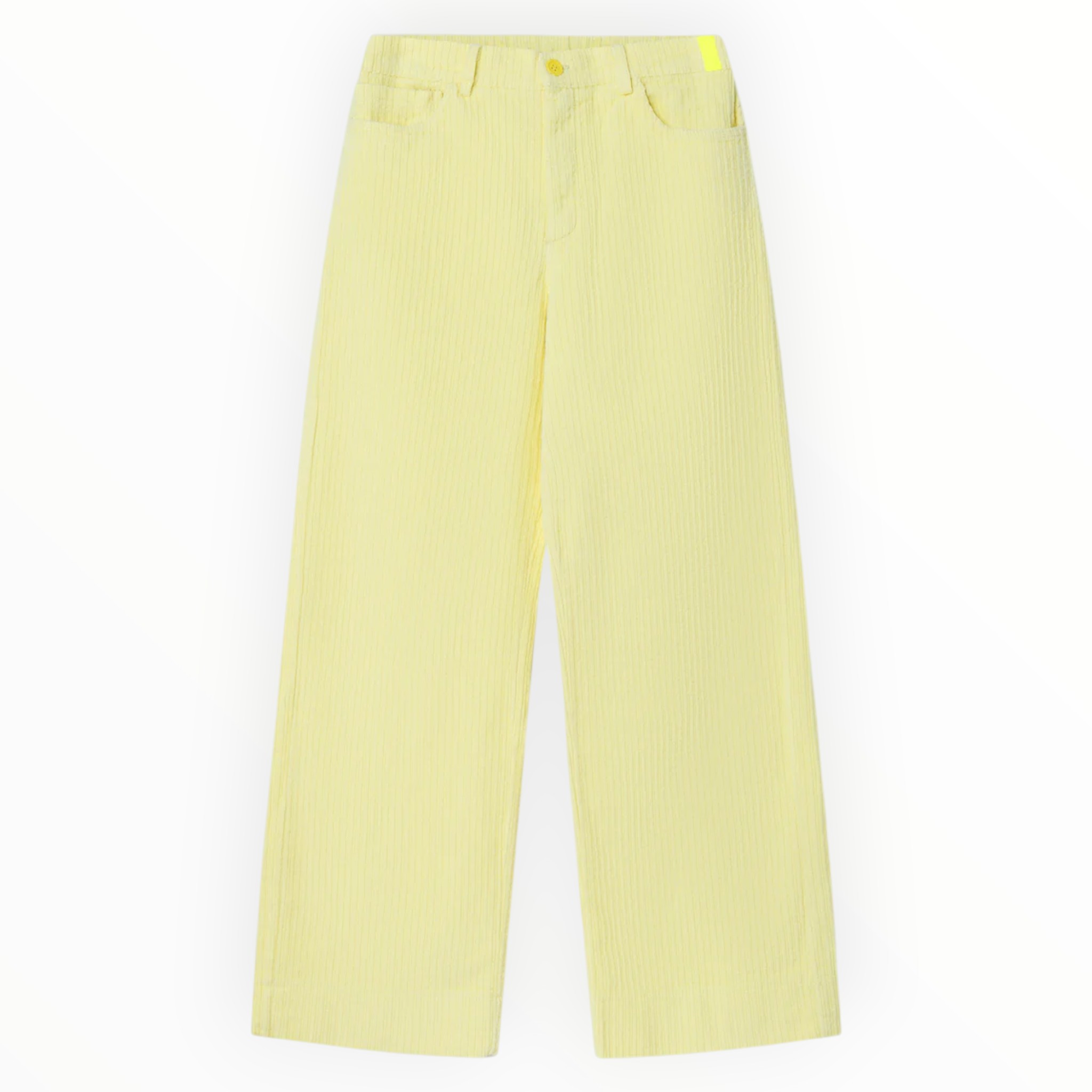 Pantalón largo, color amarillo, de pana ancha. Corte recto y ancho, confeccionado en un tejido de pana gruesa, con un punto elástico, para más comodidad. Cierre frontal mediante cremallera oculta y botón visible. Incorpora dos bolsillos laterales y dos bolsillos posteriores, además de un detalle distintivo en forma de etiqueta en neón ubicada en la parte superior del pantalón