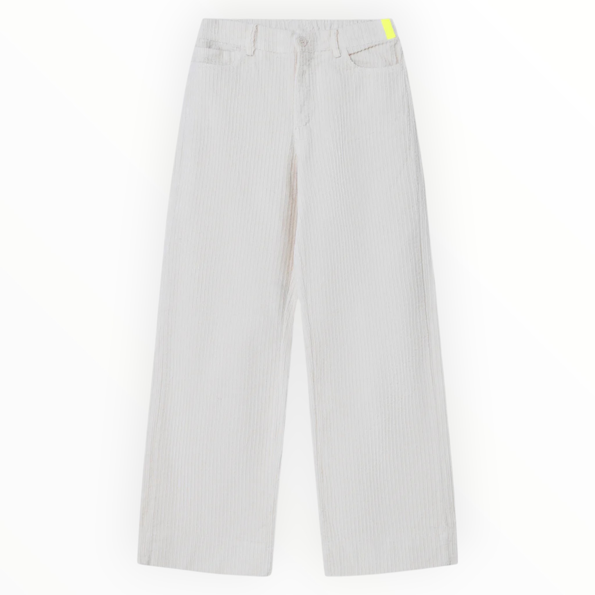 Pantalón largo, color crudo, de pana ancha. Corte recto y ancho, confeccionado en un tejido de pana gruesa, con un punto elástico, para más comodidad. Cierre frontal mediante cremallera oculta y botón visible. Incorpora dos bolsillos laterales y dos bolsillos posteriores, además de un detalle distintivo en forma de etiqueta en neón ubicada en la parte superior del pantalón.