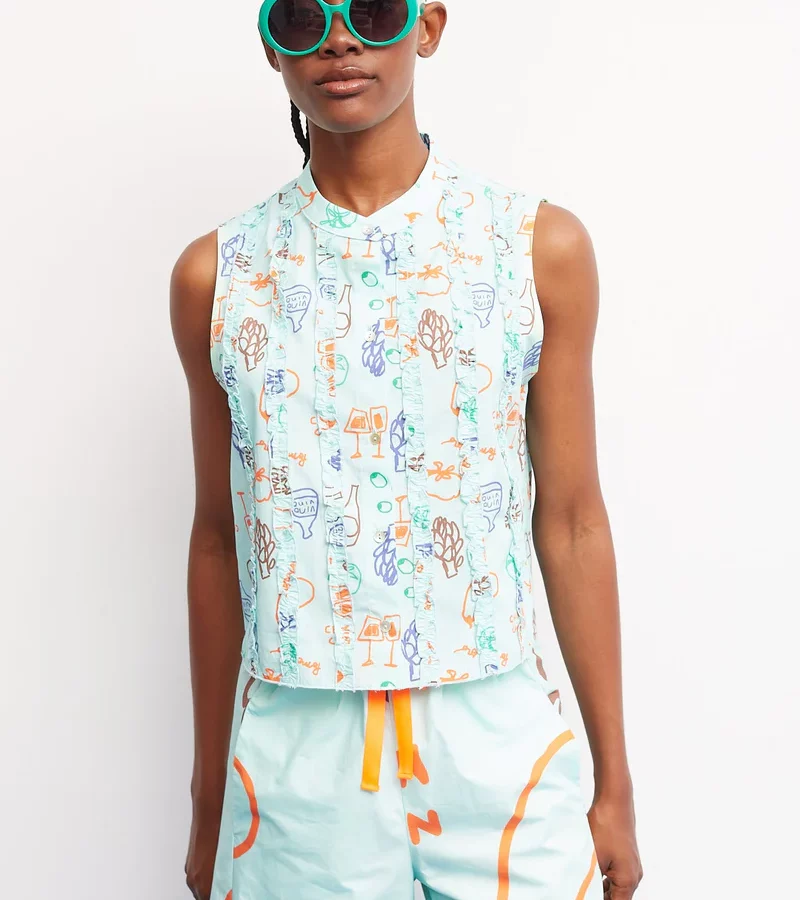 Una blusa sin mangas pensada para acompañarte durante el verano con ligereza y encanto. Destaca por su volante en el cuello que enmarca el rostro y aporta un toque diferente. El cierre frontal con pequeños botones y su corte recto crean una silueta cómoda y favorecedora, perfecta para los días más cálidos.