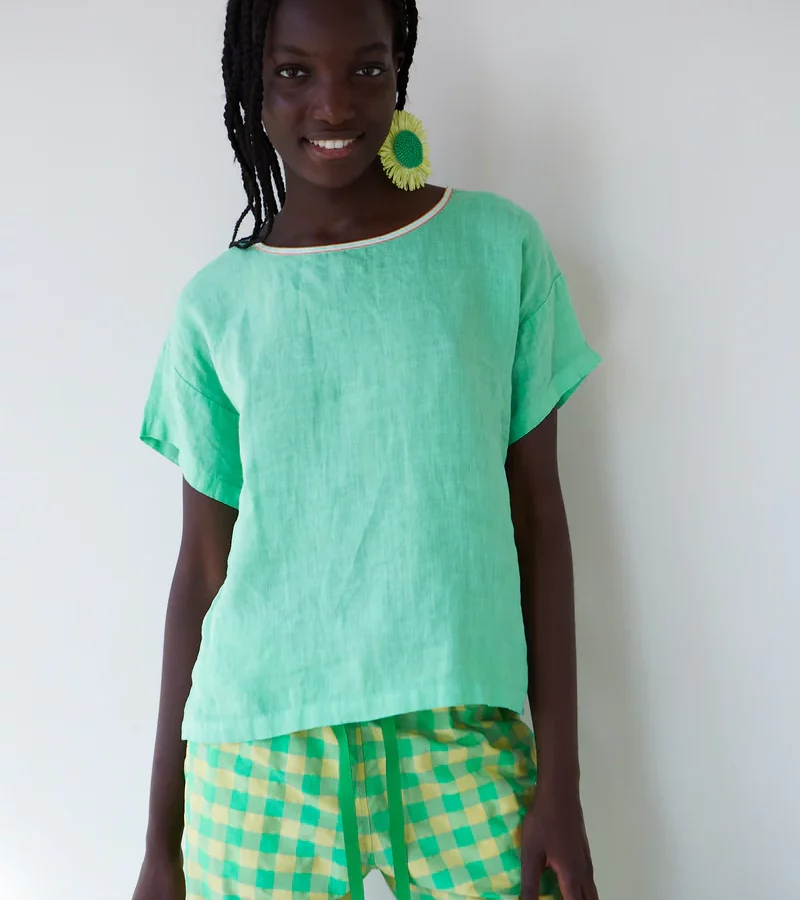 Una blusa pensada para aportar equilibrio y frescura a los looks de verano. Su diseño de rayas finas en caqui y blanco crea un efecto atemporal, mientras que el escote en pico con fruncido añade un toque relajado y único. Tiene un detalle interior en amarillo flúor. Con una silueta amplia y cómoda, y mangas cortas de corte recto, es una prenda ligera y fácil de llevar en el día a día.