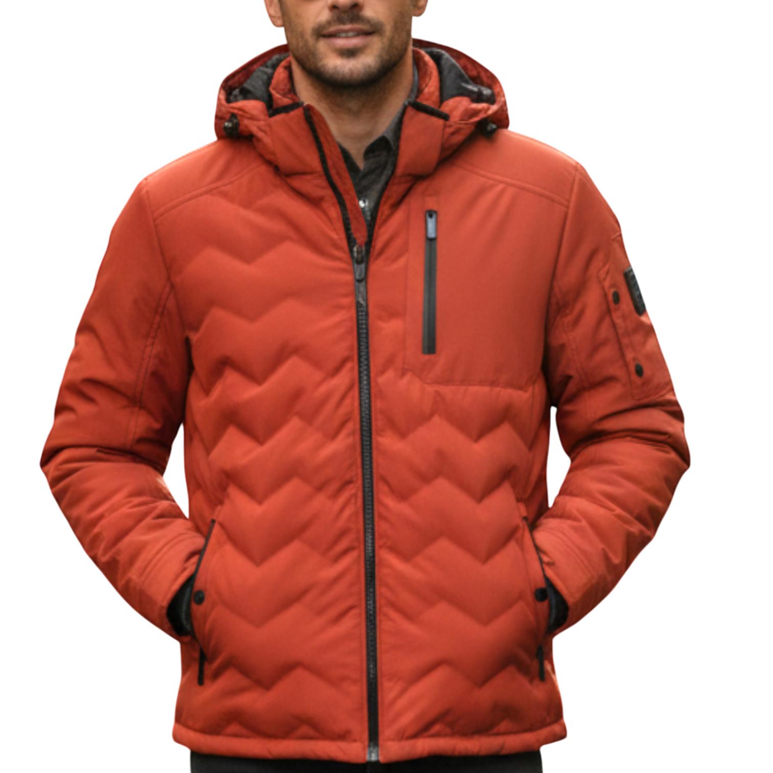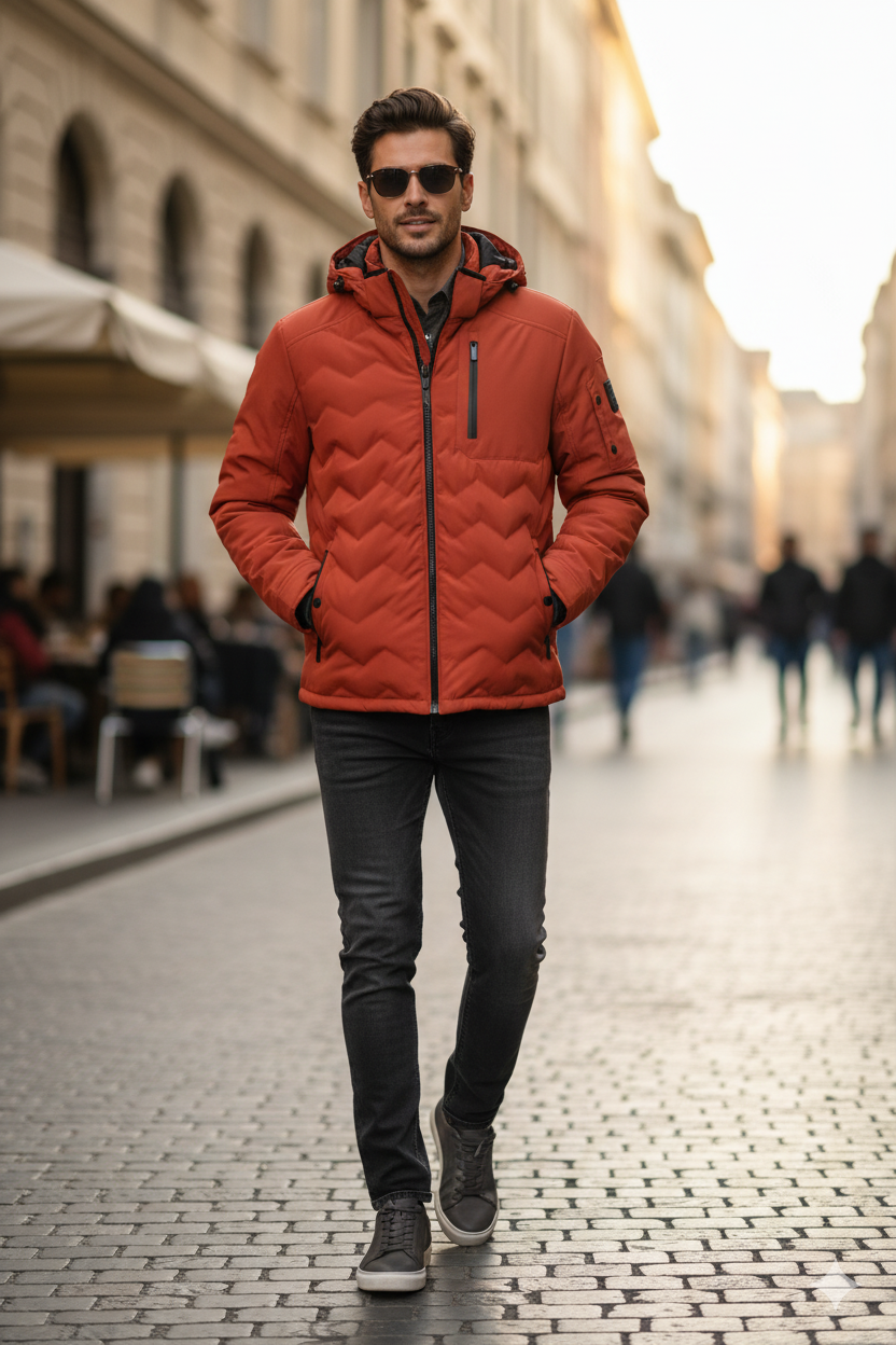 Chaquetón acolchado con cuello alto y capucha, bolsillo en pecho y dos bolsillos laterales con cremallera. Una prenda especial y cómoda para el frío.